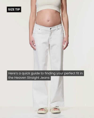 Designed for longevity, the Heaven Straight Jeans are a must in your motherhood wardrobe. With our signature elastic waistband that sits at a comfortable low to mid rise on the belly through all trimesters and well after pregnancy, these jeans have a traditional button and fly and four-pocket design and a super flattering wide-leg silhouette. The classic blue wash pairs back well with any top, and they have just the right amount of stretch.